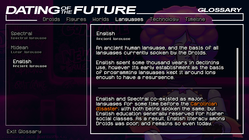 Since the game was fully developed without any consideration of a glossary being added, it is still perfectly understandable and playable without opening the glossary to read up on terms. The last thing a visual novel player wants is to read, after all.