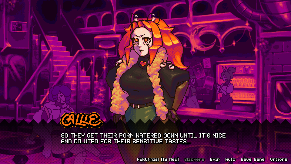 Progress on Callie's route is moving in conjunction with a general visual upgrade to the game across many different areas. The proof is sort of in the pudding with a lot of what's been going on recently, but with some .gifs and some imagination, I'm sure you'll get the gist of it. I believe in you.