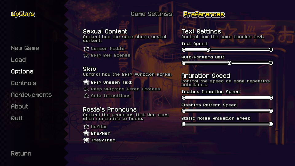 The options menu has had a radical expansion; fitting in a bevy (yes, one whole bevy) of new options and features. These include the ability to change certain visual effects that may cause eye strain in some users(i.e. the game's text box animation and Mel's hair animations).