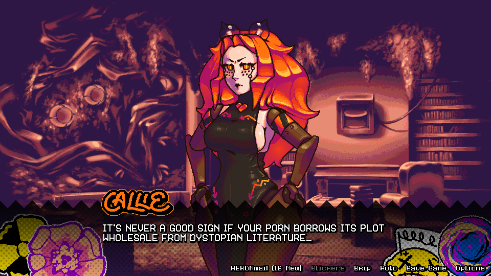 There's a certain sense throughout the game (one that I quite intentionally added) of aloofness to Callie. Characters seem to have variably messy histories with her, and the player's personal experience with her up until the beginning of her route can be described as somewhat difficult at worst, and curious at best. Where other dating-format visual novels tend to have their final or "hardest" route be with the supreme woman of the player's desires, DATING OF THE FUTURE has never been about giving people what they think they want, as much as showing people something they never even realised they wanted.