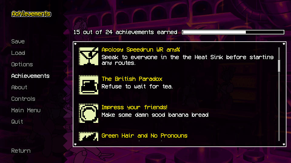 The final plan was always to have four major extra features: a sound room, a replay gallery, a concept art gallery, and achievements. I'm happy to say that most of these features are implemented, if not complete.